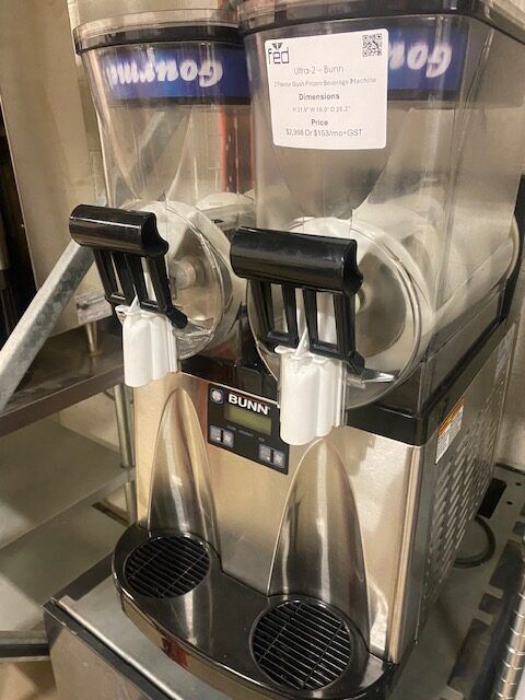 You are viewing a nicely used 2 Flavour Frozen Beverage Slush Machine. This Bunn Ultra 2 model has been tested and works very well. It measures 16″ W x 26.2″ D x 31.9″ H. These sell new for $5000+. We also sell other new models and have financing options. Our Clearance Warehouse is located in the Foothills Industrial Park #5, 6613 – 44th Street SE, Calgary, AB. Open Monday to Friday 9am to 5pm.