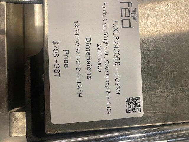 You are viewing a nicely used panini press. This Foster FSXLP2400RR model has been tested and works very well. It measures 18-3/8″ W x 22-1/2″ D x 11-1/4″ H. Requires 208/240 Volt power. These sell new for $1800+. We also sell other new models and have financing options. Our Clearance Warehouse is located in the Foothills Industrial Park #5, 6613 – 44th Street SE, Calgary, AB. Open Monday to Friday 9am to 5pm.