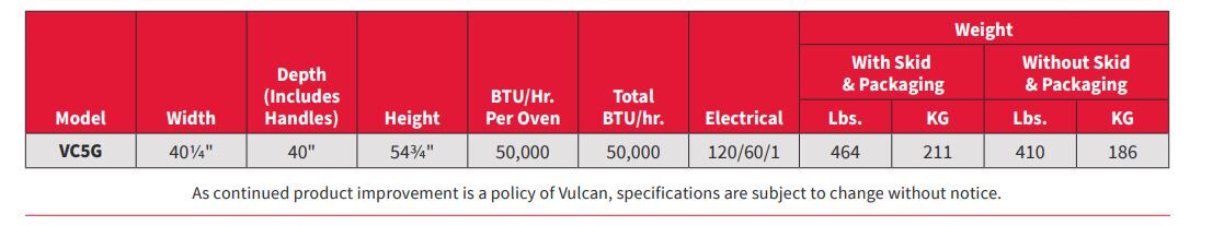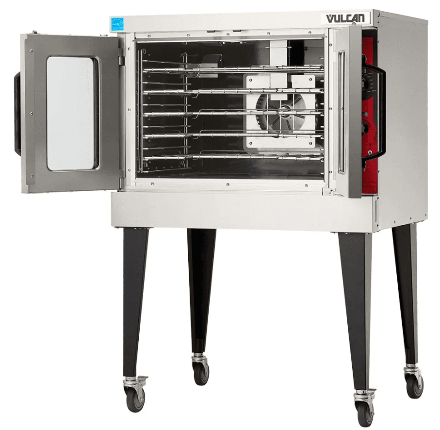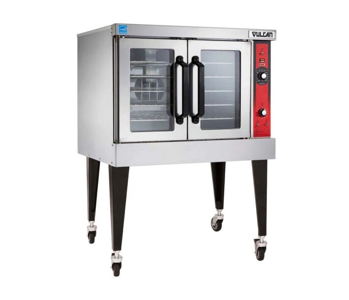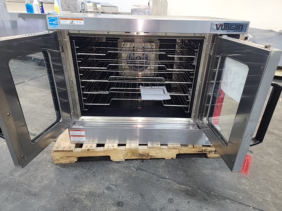 The Vulcan Ecomax FGC100 is a full-size natural gas convection oven designed for commercial kitchen use. It features a stainless steel construction and can accommodate 5 full-size sheet pans13. The oven has a temperature range of 150-550°F (65-290°C) and includes three adjustable shelves1. With dimensions of 38 inches in width, 43 inches in depth, and 58 inches in height, it weighs approximately 404 lbs13. The Ecomax FGC100 boasts a total heating capacity of 54,000 BTU/Hr and operates on 120V electricity13. It includes features such as independent doors with full view windows, interior halogen lighting, and a 2-speed fan motor for even heat distribution.