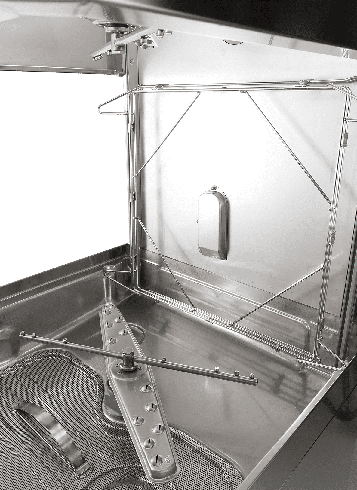 - Inclined wash arms and ceiling to avoid washed water drops containing detergent on clean wares after the rinsing phase