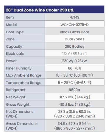 This freestanding dual zone wine cooler from Omcan is a great choice for the wine connoisseurs and bars. It can store as many as 290 bottles of wine.