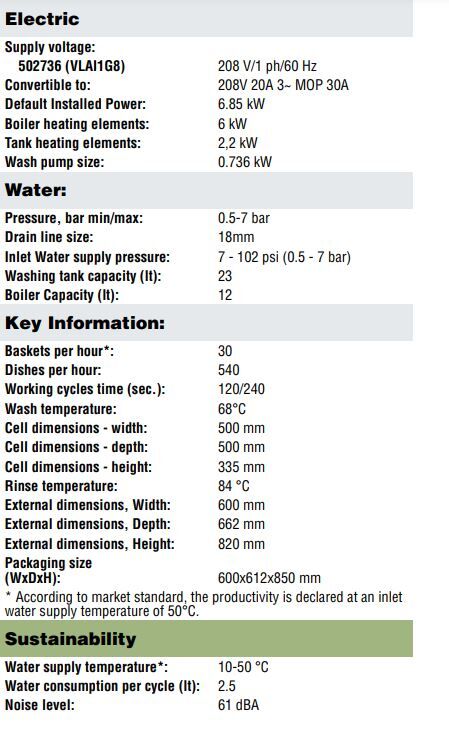 - Washing capacity of 30 baskets or 540 dishes per hour.